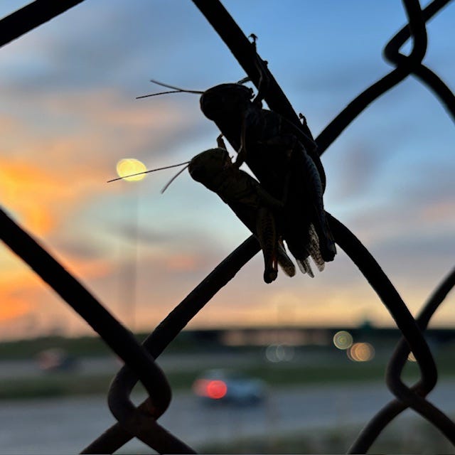 One week in, and I’m already looking at insects differently. Minuscule maggots attached to the inside of our compost bucket sprang to life not spontaneously (abiogenesis) from my laziness, but because flies had oviposited their eggs on the decomposing organic matter. But people used to believe that meat created maggots, as God created Man - abruptly and maybe due to pneuma. And I wondered while looking at the pair of grasshoppers that watched the sunset together while clinging to the chained link of a fence that separated me and Megan from the interstate, if they also leave abrasions on the dead that resemble sulfuric acid poisoning, the way cockroaches can. A “Ctrl” + “F” search of my textbook did not reveal the answer, but I did learn that female grasshoppers will sometimes eat the spermatophore from the male after mating. Apparently, it’s nutritious. And yet, the praying (in reality, it seems like “preying” would also work) mantis is the one who gets all the attention. Eating a sack of sperm reminded me of how I was able to convince the girls on our floor of the dorm in college that I saved semen in baby food jars in the freezer to use on my skin because of the high Vitamin E content.