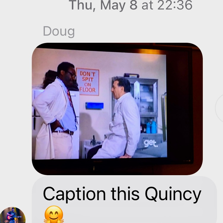 My bestie, Doug, still watches Quincy quite often, usually in the evening as he winds down. He will text me random snippets of the show, and earlier this year, he sent this TV screengrab to our group thread along with a caption challenge: